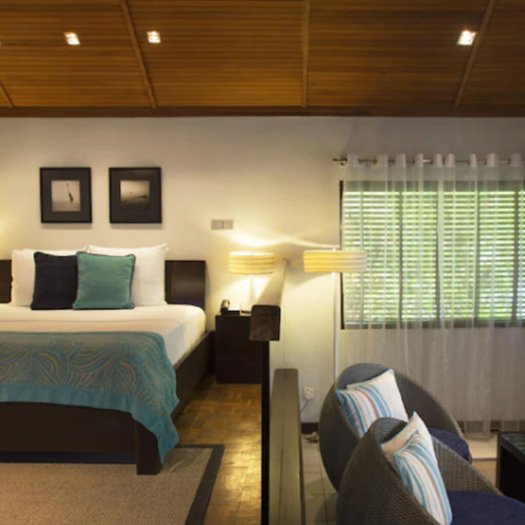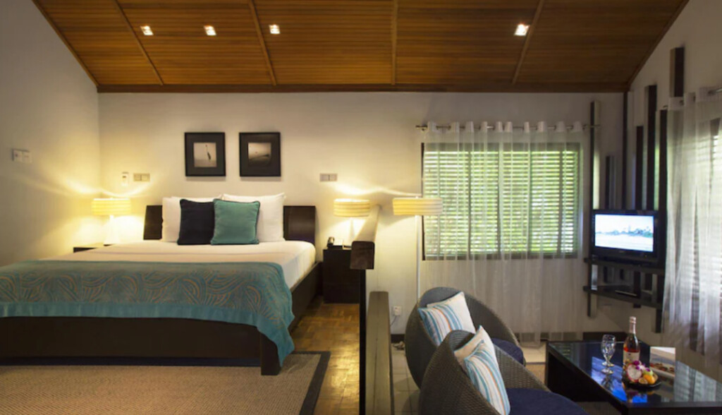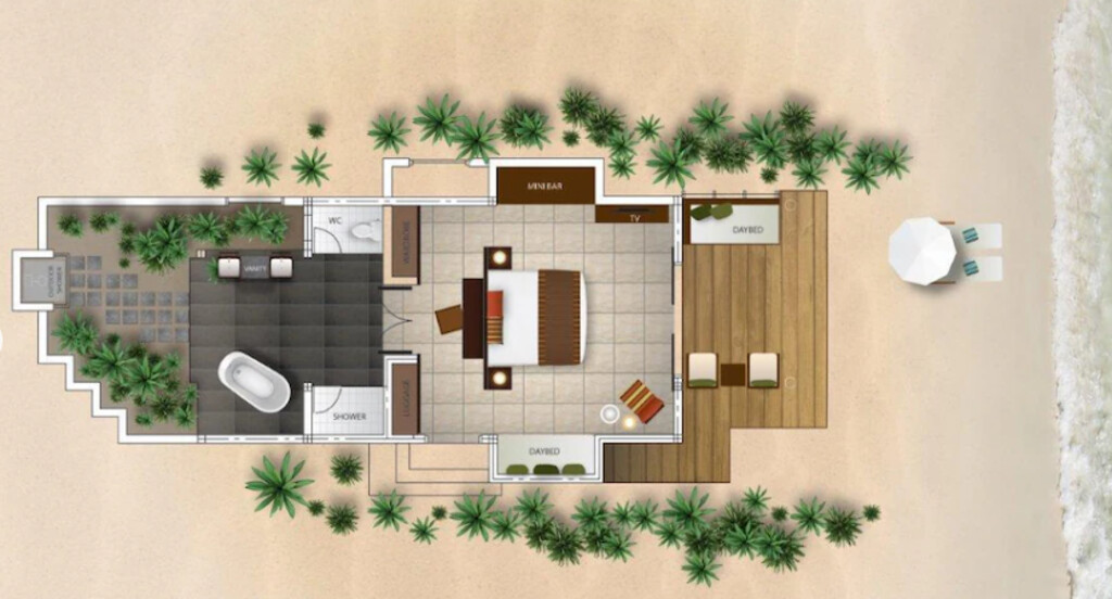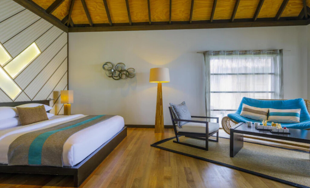 Velassaru의 방갈로와 빌라가 열대 기후에 맞게 목재 천장과 바닥으로 마감되어 있고, 에어컨과 천장 선풍기를 갖추고 있습니다. 각 객실에 세계 각국의 방송이 편성된 평면 TV와 DVD 플레이어가 구비되어 있습니다. 일부 객실에는 네스프레소 머신과 와인 냉장고도 있습니다. 전용 욕실에는 록시땅 목욕용품, 해변용 가방, 슬리퍼가 마련되어 있습니다.